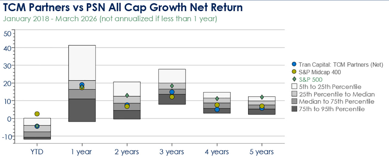 (1) Past performance is not indicative of future results. The actual return and value of an account will fluctuate and at any point in time could be worth more or less than the amount initially invested. Performance is provided as supplemental information and is based on the Multi-Cap Growth Equity Strategy Composite. Performance results reflect all income, gains and losses and the reinvestment of interest and other income. All rates of return are reported “NET” of fees. Additional information regarding the policies for calculating and reporting returns is available upon request.